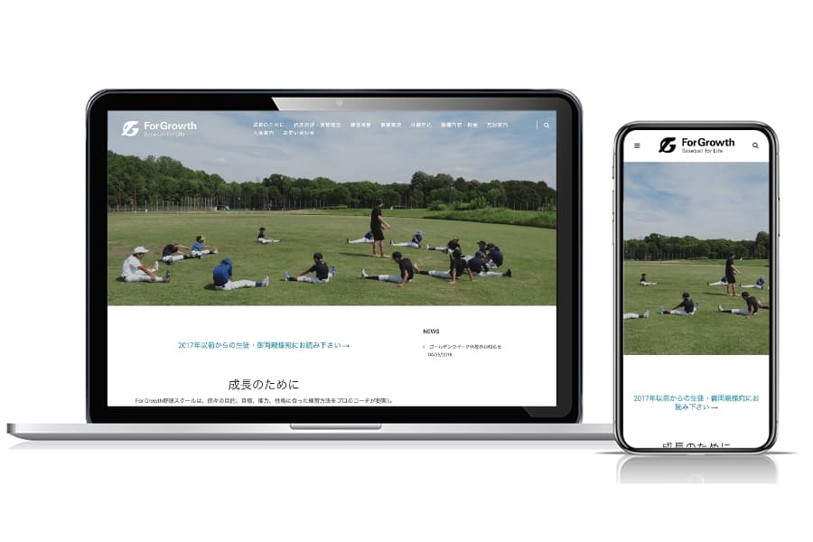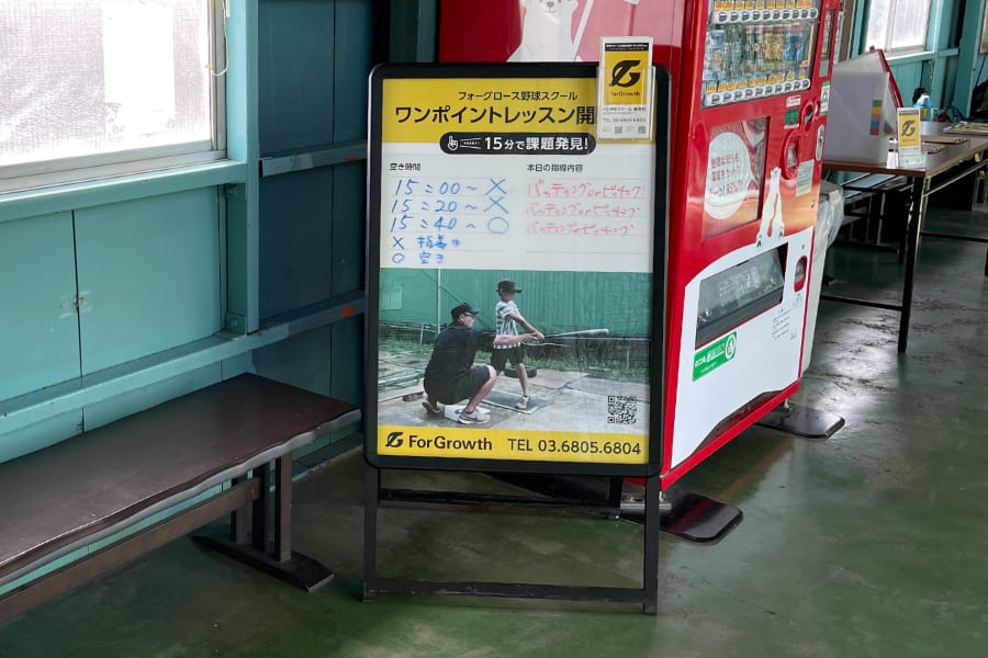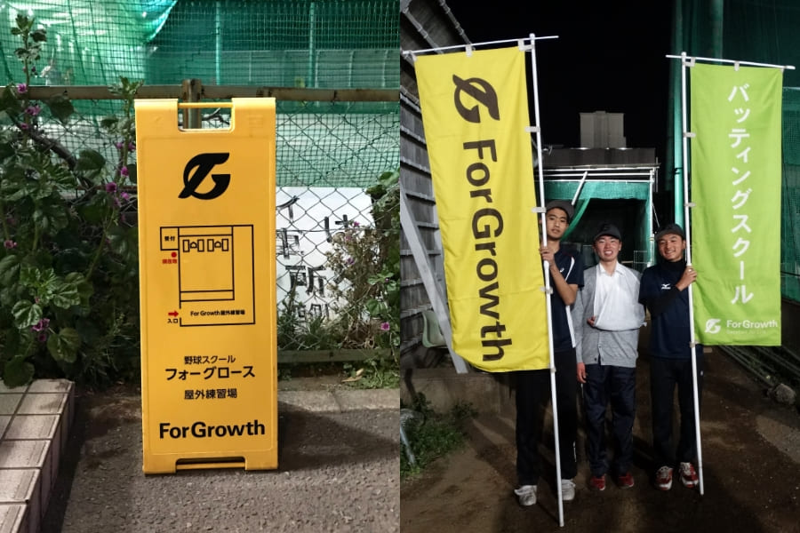 For Growth 野球スクールのブランディングにスタンド看板、カッティングシート、のぼりを制作して貢献しました。